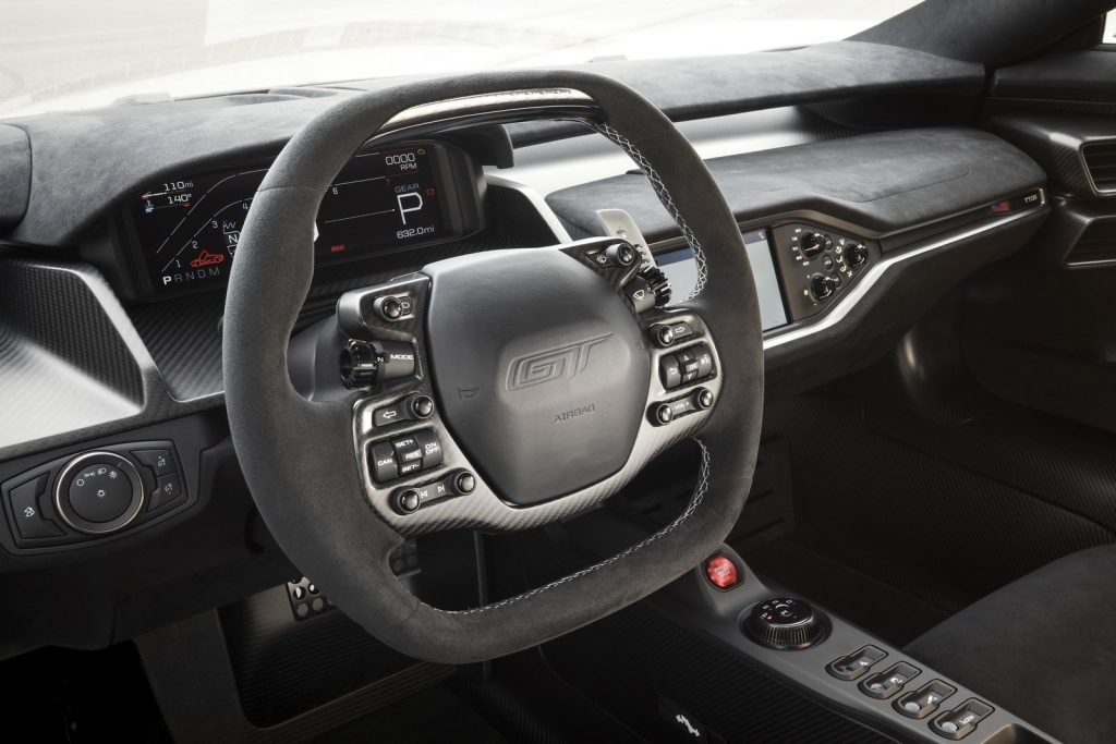 Karbon fiber festivali, kapı eşiğinde, orta konsolda ve gösterge panelinin altındaki ve önündeki hafif kompoziti bulabileceğiniz kabinin içinde devam ediyor. Ford ayrıca koltuk döşemelerini koltuk başlıklarına kadar uzanan gümüş dikişli yeni bir desene değiştirdi. Spor direksiyon simidi ve anodize paddle değiştiricilerde benzer bir görünüme sahip dikişler var. Panodaki benzersiz rozet görsellerin dışına çıkar.